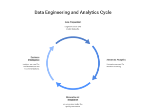 Data engineering cannot exist without advanced analytics. Engineers prepare, clean, and model datasets for machine learning and predictive model creation. Generative AI has sped up engineering tasks like data quality assurance, anomaly reporting, and pipeline optimization. Repetitive tasks can now be fully automated which shortens development timeframes while supporting business intelligence use cases around fraud detection, personalized recommendations, and smart supply chain management.
